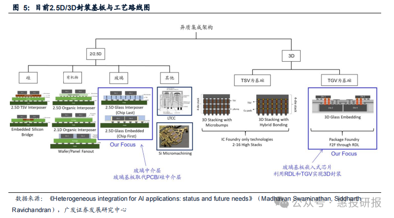 玻璃材质的引入可以取代原先的硅中介层和有机基板。玻璃基板直接利用玻璃中介层(GlassInterposer)实现芯片之间、芯片与外部的互联,利用玻璃材质成本低、电学性能好、翘曲低等优点来克服有机物材质和硅材质的缺陷,来实现更稳定、更高效的连接以及降低生产成本,有望为2.5D/3D封装带来全新的范式改变。