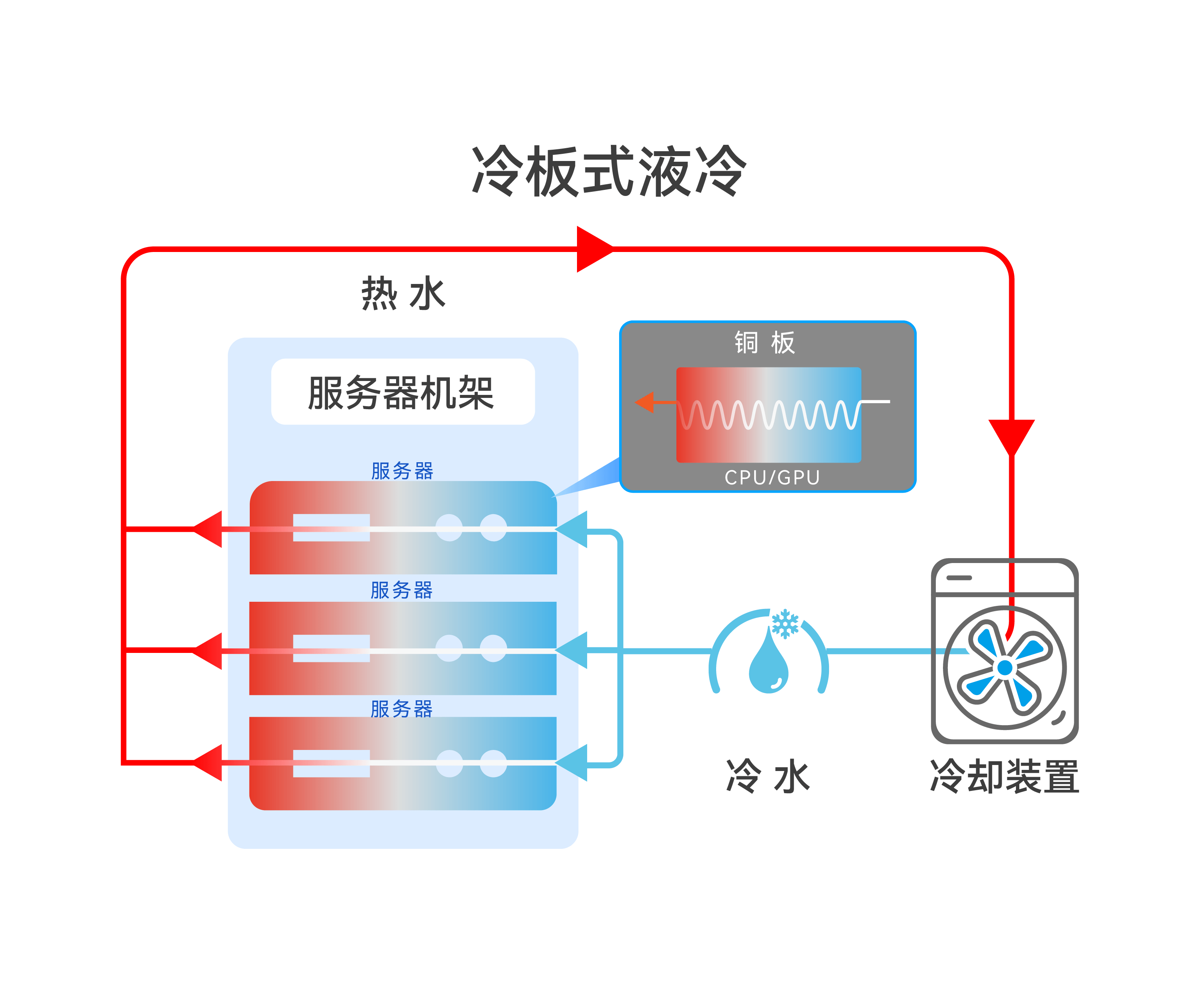 冷板式液冷是一种常见的芯片散热方式,它通过铜、铝等高导热金属构成的封闭腔体制成的冷板将芯片等高热密度元器件的热量传递给循环管道中的冷却剂,然后利用冷却剂将热量带走,进而实现散热。