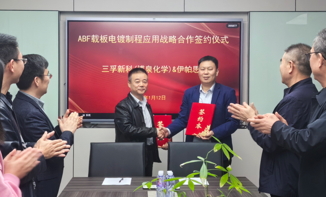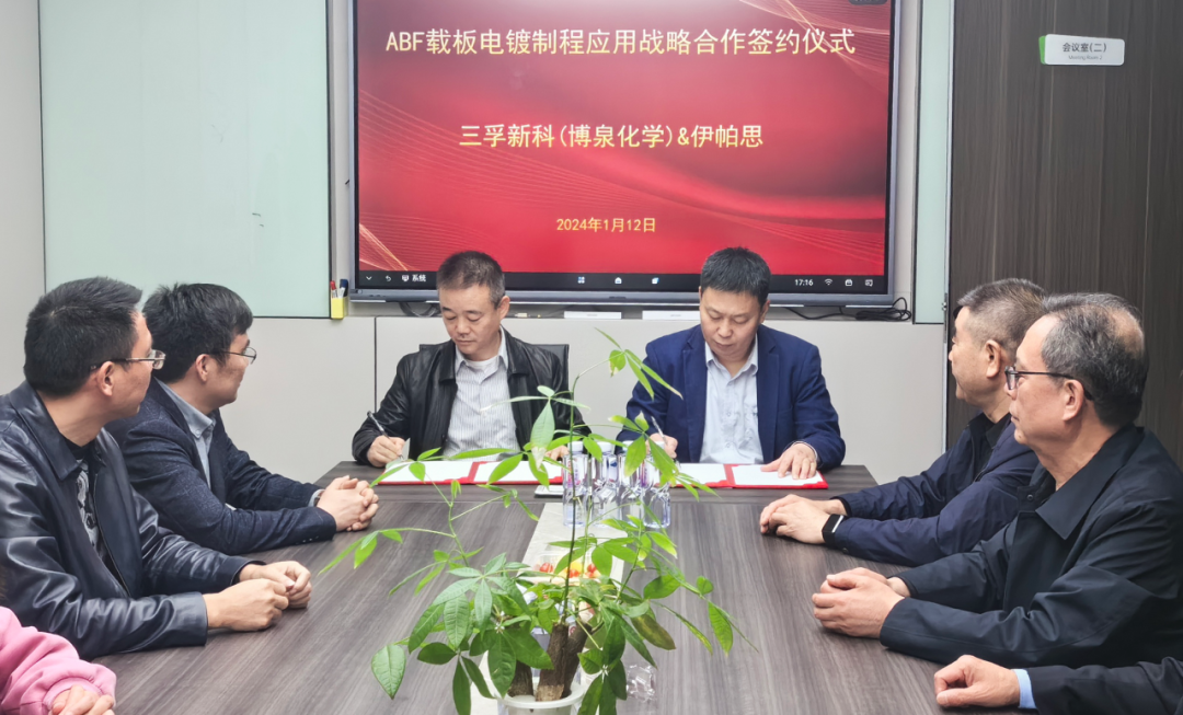 1月12日,三孚新科旗下高端线路板药水供应商江西博泉化学有限公司与深圳伊帕思新材料科技有限公司战略签约仪式于伊帕思知识城研发中心圆满举行。本次战略合作,双方将就IC载板基材积层胶膜领域、特化品电镀药水领域等进行技术合作、研发应用,实现合作共赢,为提高国内FCBGA封装用ABF载板国产化贡献力量。