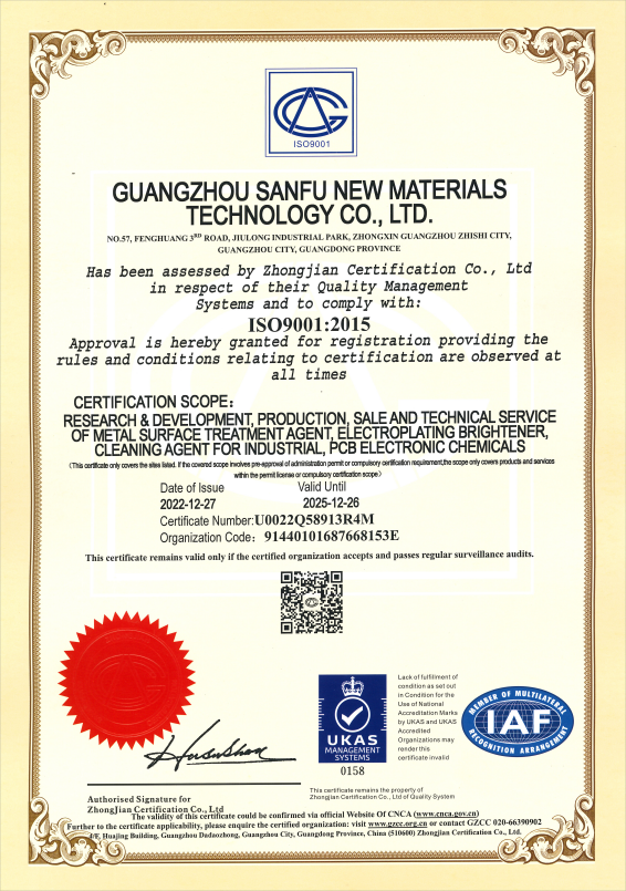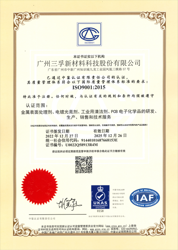 | 17 | 无氰高密度铜镀液获得2017年广东省高新技术产品认定 | 广东省高新技术企业协会 | 2017年12月 |